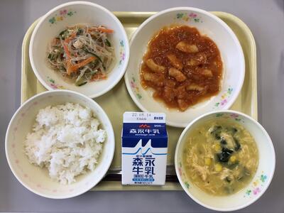 ごはん,牛乳,いかのチリソース煮,春雨サラダ,コーン卵スープ