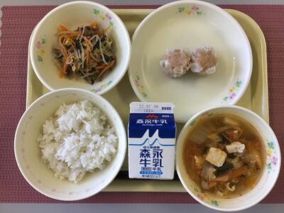 わかめごはん,牛乳,揚げぎょうざ,ごぼうサラダ,もやしのスープ