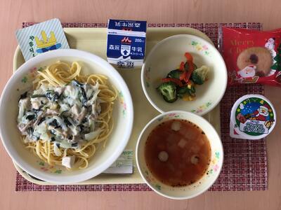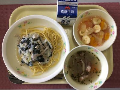 春キャベツのクリームスパゲティ,牛乳,豆と野菜のトマトスープ,アセロラゼリー和え