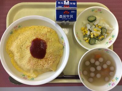 オムライス、牛乳、イタリアンサラダ、豆と野菜のスープ