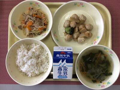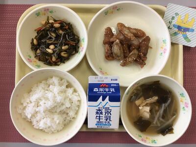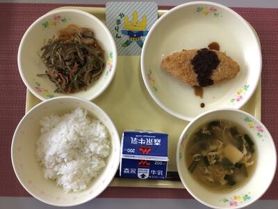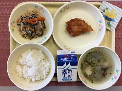 ごはん、牛乳、豚肉とごぼうのかりん揚げ、ひじきの炒り煮、小松菜と厚揚げのみそ汁