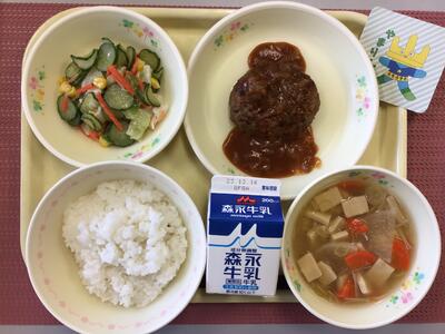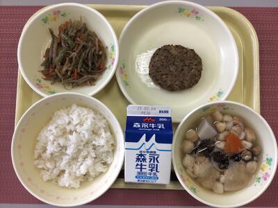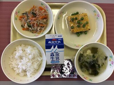 枝豆と塩昆布の混ぜごはん、牛乳、花型豆腐ハンバーグのあんかけ、小松菜のごま和え、かきたま汁、お祝いクレープ
