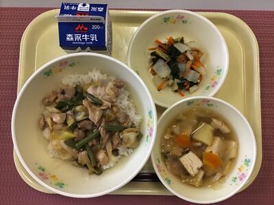 ごはん,牛乳,鶏肉のねぎソースがけ,野菜と卵の和え物,たけのこのみそ汁
