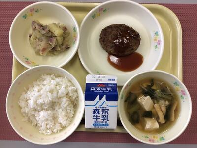 きなこ揚げパン、牛乳(コーヒー牛乳の素)、ハンバーグケチャップソースがけ、ツナポテサラダ、コーンポタージュ