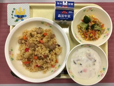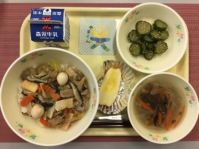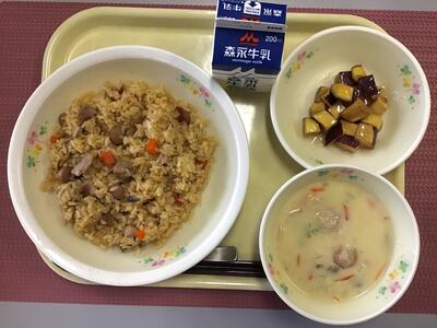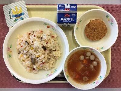 たけのこごはん,牛乳,かつおフライ,わかめ入り和風サラダ,ひきな汁