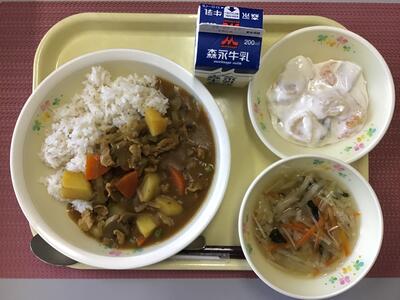 ポークカレー(麦ごはん)、牛乳、ブロッコリーソテー、いちご