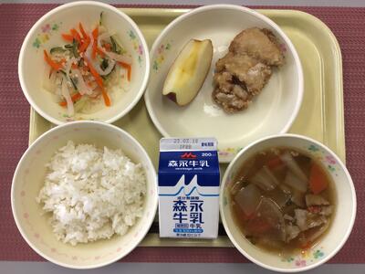 ごはん、牛乳、鶏の唐揚げ、かみかみサラダ、白菜のみそ汁