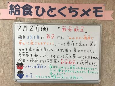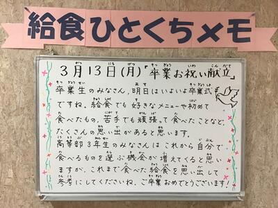 今年度の給食ブログは今回が最後になります。本校で児童生徒のみなさんが食べている給食や給食ひとくちメモを知っていただくことで、それが家族団らんの話題や食育につながったとすればこんなにうれしいことはありません。これまで見てくださったみなさん、本当にどうもありがとうございました。