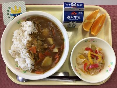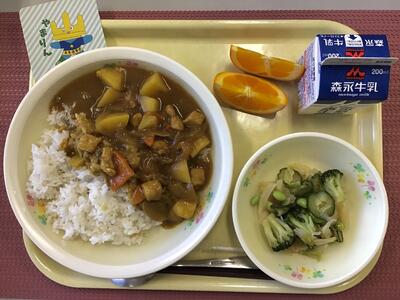 チキンカレー(麦ごはん),牛乳,グリーンサラダ,オレンジ(2個)