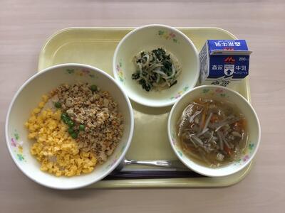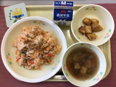 五目チャーハン、牛乳、ごぼうの甘辛揚げ、わかめスープ
