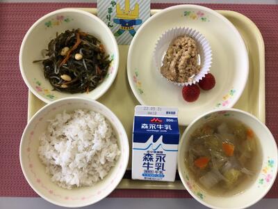 わかめごはん,牛乳,五目卵焼き,かみかみサラダ,キャベツと油揚げのみそ汁