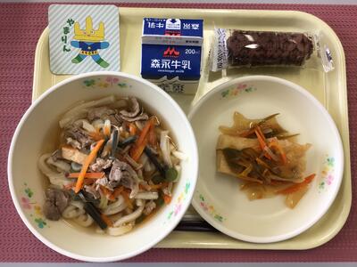 山菜うどん,牛乳,笹かまぼこの天ぷら,レモン酢和え,ミニココアワッフル