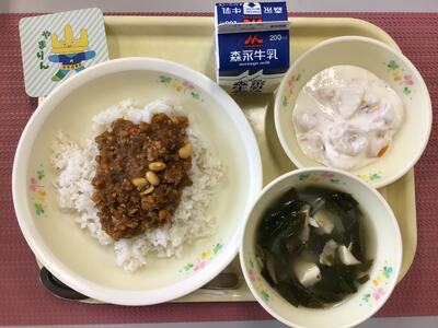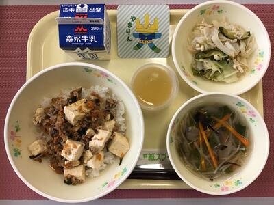 マーボー丼(麦ごはん)、牛乳、レモン酢和え、なめこ入り卵スープ