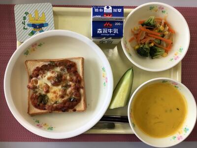 食パン(ブルーベリージャム),牛乳,かぼちゃコロッケ,ペンネのミートソースソテー,春野菜のポトフ