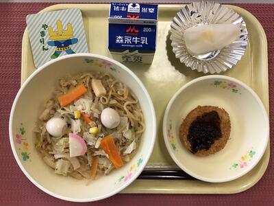 ナポリタン、牛乳、ハートのポテトコロッケ(ソース)、洋風かきたまスープ、チョコプリン