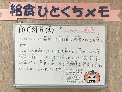 学校給食週間4日目の今日は「スパゲティがたべたいよう」(角野栄子著 ポプラ社の小さな童話)より、スパゲティを取り入れました。人をおどかして、おいしいものを横取りしていたおばけのアッチでしたが、きちんと「ごちそうしてください。」と言う場面、子ども達の心に残るといいなと思います。