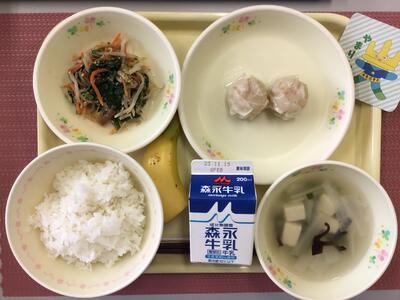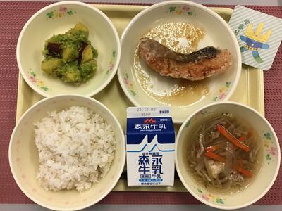 ごはん,牛乳,銀鮭の照り焼き,さつまいものずんだ和え,けんちんうーめん汁