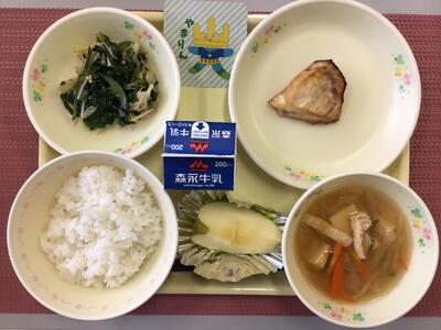 麦ごはん、牛乳、さわらのねぎみそ焼き、れんこんの塩きんぴら、けんちん汁