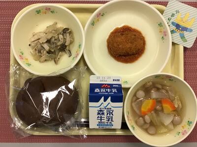 食パン(いちごジャム)、牛乳、かぼちゃとさつまいものコロッケ、チリコンカン、ジュリエンヌスープ