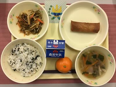 ごはん,牛乳,春巻,まめまめサラダ,みそ野菜スープ