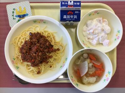 〈献立名〉 スパゲティミートソース 牛乳 フルーツヨーグルト和え コロコロ野菜スープ