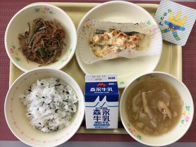 わかめごはん、牛乳、たらのカラフルマヨネーズ焼き、五目きんぴら、玉ねぎとキャベツのみそ汁