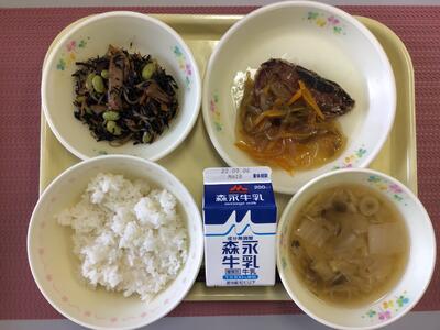 麦ごはん,牛乳,さばのみそ煮,切り干し大根のカレー炒め,五目すまし汁