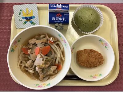 けんちんうどん、牛乳、まぐろカツ、山元町産桑の葉入り蒸しパン