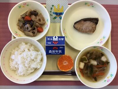 麦ごはん、牛乳、さわらのねぎみそ焼き、れんこんの塩きんぴら、けんちん汁