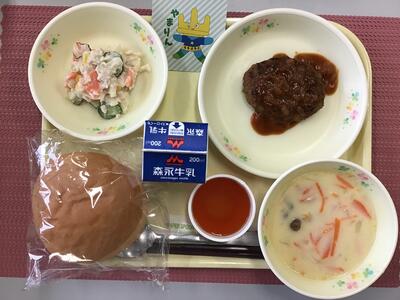 きなこ揚げパン、牛乳(コーヒー牛乳の素)、ハンバーグケチャップソースがけ、ツナポテサラダ、コーンポタージュ