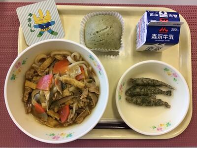カレーうどん、牛乳、わかさぎフリッター、山元町産桑の葉入り蒸しパン