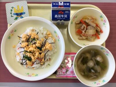 〈献立名〉ちらしずし 牛乳 白菜の煮浸し 鶏団子のすまし汁 ひなあられ