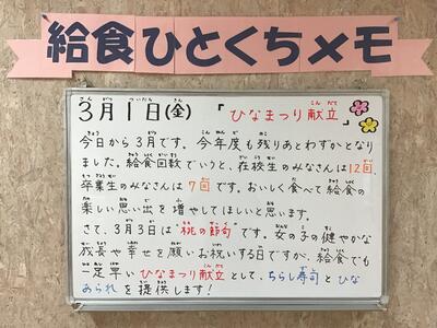 「ひなまつり給食」でした。華やかなちらし寿司とひなあられで健やかな成長をお祝いしました。