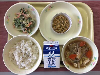 麦ごはん、牛乳、スタミナ納豆、ごまきゅうり漬け、塩ちゃんこ汁、ヨーグルト