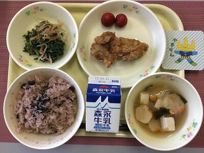 赤飯(ごま塩),牛乳,鶏の唐揚げ,葉の花のごま和え,花麩のすまし汁,いちご