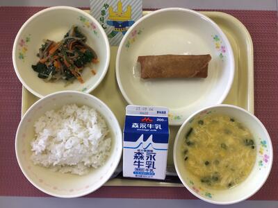 ごはん、牛乳、春巻、細切り昆布のピリ辛炒め、みそ野菜スープ