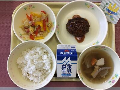 ごはん,牛乳,ハンバーグケチャップソースがけ,パプリカ入りソテー,のっぺい汁
