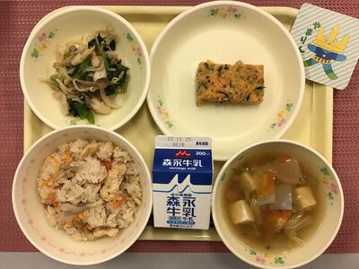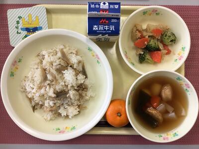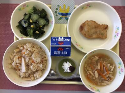 たけのこごはん,牛乳,たらのすりみフライ,わかめ入り和風サラダ,ひきな汁,桑の葉プリン