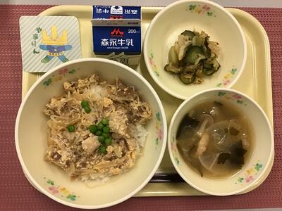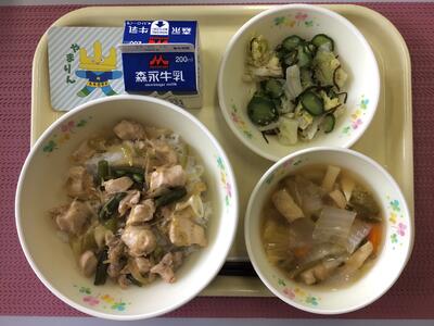 焼き鳥丼(麦ごはん),牛乳,キャベツときゅうりの塩昆布和え,具だくさんのみそ汁
