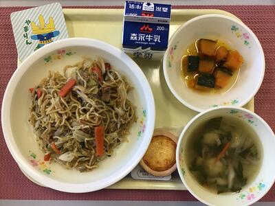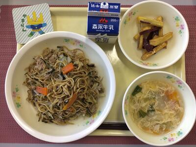にら入りソース焼きそば,牛乳,さつまいもスティック,中華卵スープ