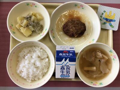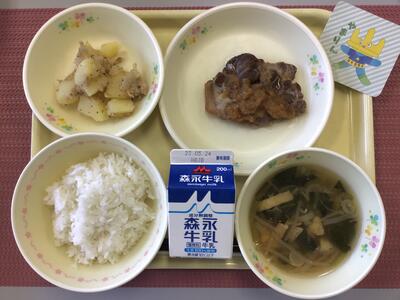 わかめごはん,牛乳,ちぐさ卵焼き,れんこんの塩きんぴら,じゃがいものみそ汁