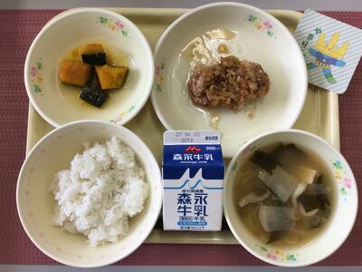 ごはん、牛乳、揚げ鶏のねぎソースがけ、かぼちゃの甘煮、かぶのみそ汁