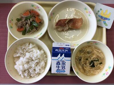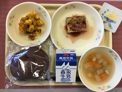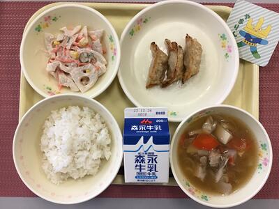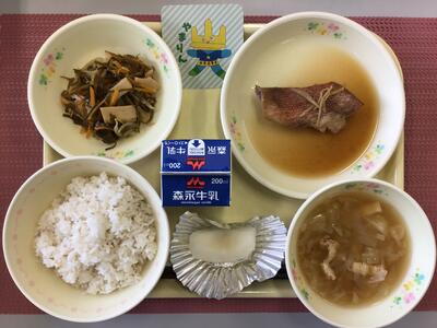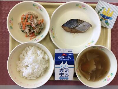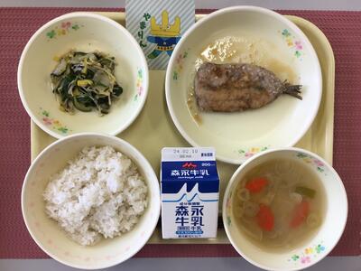 麦ごはん、牛乳、さわらのねぎみそ焼き、れんこんの塩きんぴら、けんちん汁