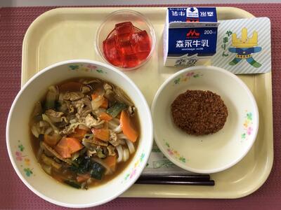 山菜うどん、牛乳、揚げ出し豆腐の野菜あんかけ、ミニココアワッフル
