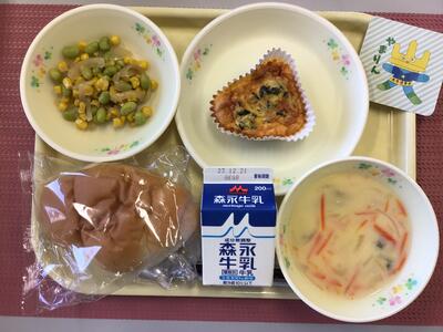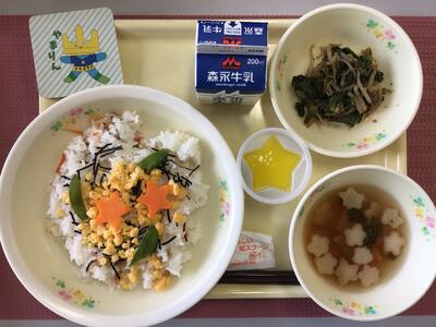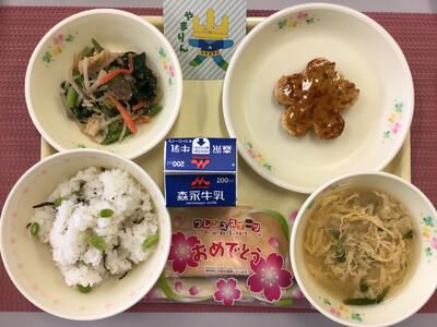 枝豆と塩昆布の混ぜごはん、牛乳、花型豆腐ハンバーグのあんかけ、小松菜のごま和え、かきたま汁、お祝いクレープ
