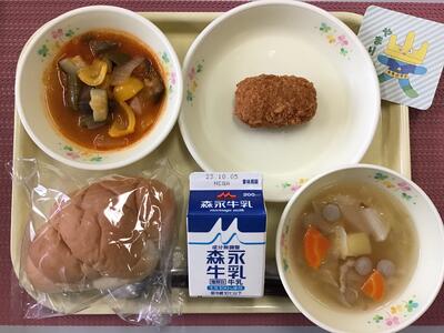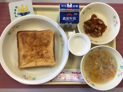 食パン(いちごジャム)、牛乳、かぼちゃとさつまいものコロッケ、チリコンカン、ジュリエンヌスープ