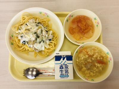 春キャベツのクリームスパゲティ,牛乳,スコッチブロス,アセロラゼリー和え
