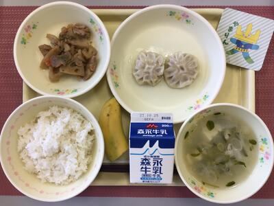 ごまごはん,牛乳,えびしゅうまい,まめまめサラダ,大根のスープ