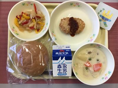 食パン(はちみつマーガリン),牛乳,コーン入りクリームコロッケ,ブロッコリーソテー,ミネストローネ