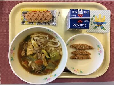 けんちんうどん,牛乳,しらす入りかき揚げ,山元町産桑の葉入り蒸しパン
